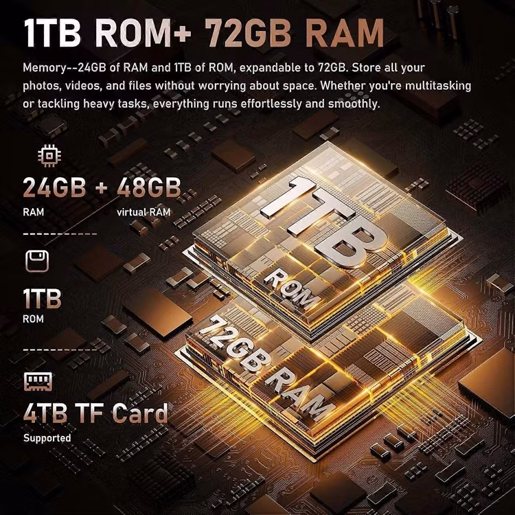 MediaTek Dimensity 8200-processor tillsammans med 24 GB RAM (utbyggbart till 48 GB virtuellt minne) och 1 TB lagring garanterar exceptionell prestanda. Multitasking, spel och krävande appar fungerar sömlöst.