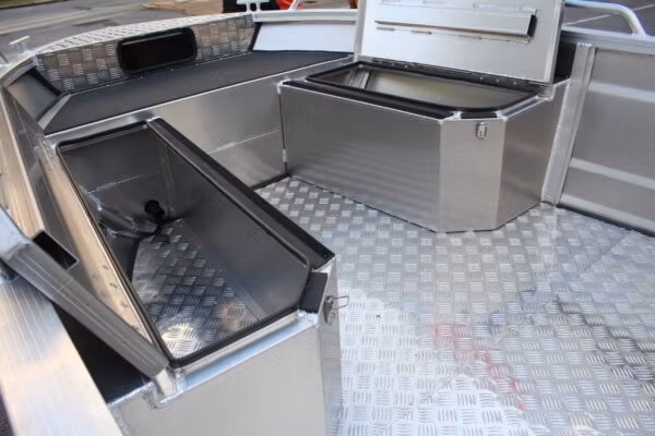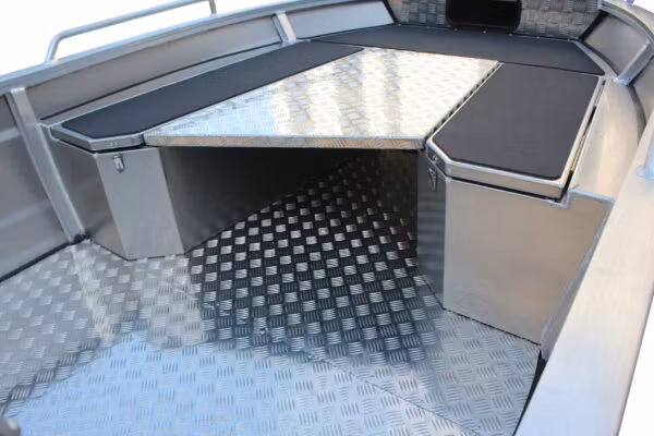 Den robusta aluminium konstruktionen ger en trygg, stadig känsla även när du rör dig ombord eller fiskar stående. Det plana kastdäcket skapar generösa arbetsytor och utmärkt balans, samtidigt som den öppna layouten ger gott om plats för utrustning, rörelse och smart förvaring. Vill du använda båten för transporter eller nöje plockar du enkelt bort kastdäcket och får en traditionell styrpulpetbåt som är anpassad för dina behov för dagen. Skrovets utformning bidrar till en följsam och säker gång, även när förhållandena skiftar.